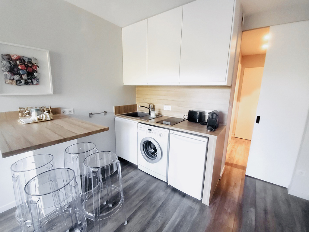 Cuisine entièrement équipée : plaque de cuisson à induction, four micro-ondes, cafetière Nespresso, grille pain, réfrigérateur, machine à laver.