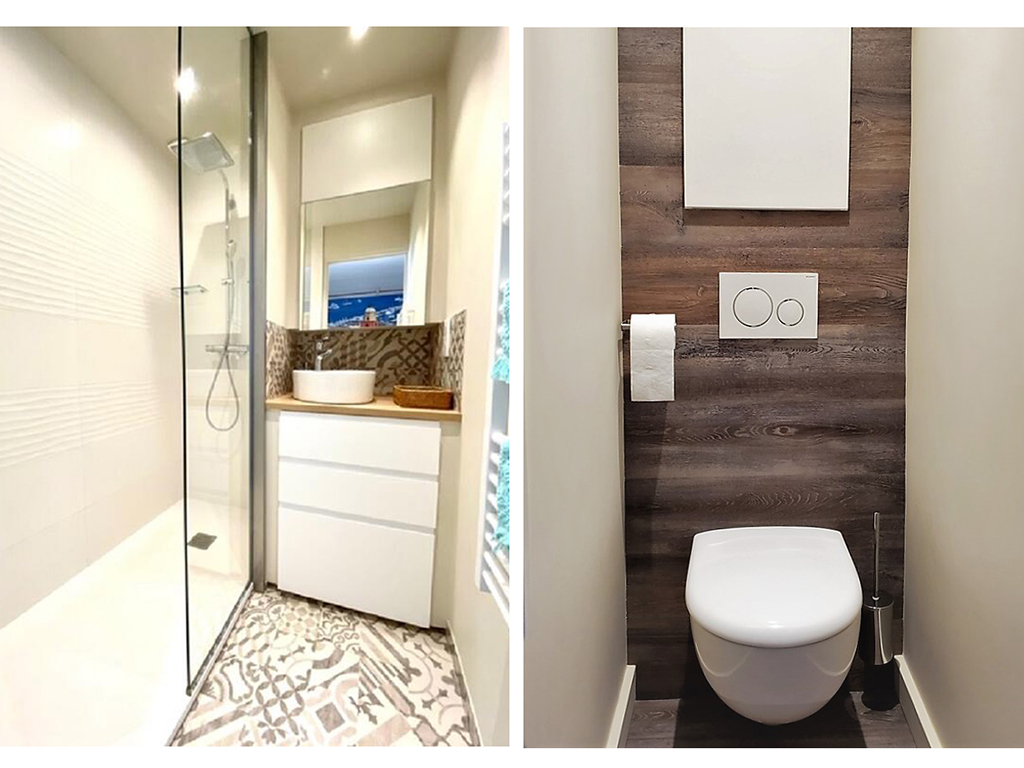 Salle de bains avec douche italienne, sèche cheveux, WC séparé.
